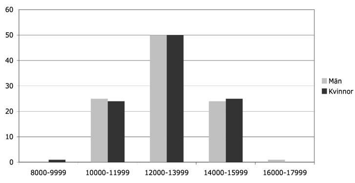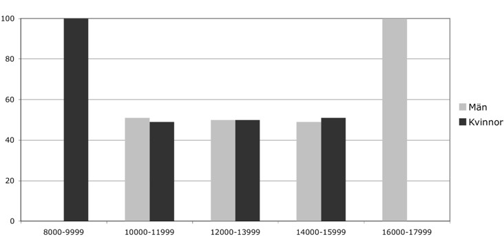 Figur 2. Fördelning i procent på olika löneklasser för män respektive kvinnor.
