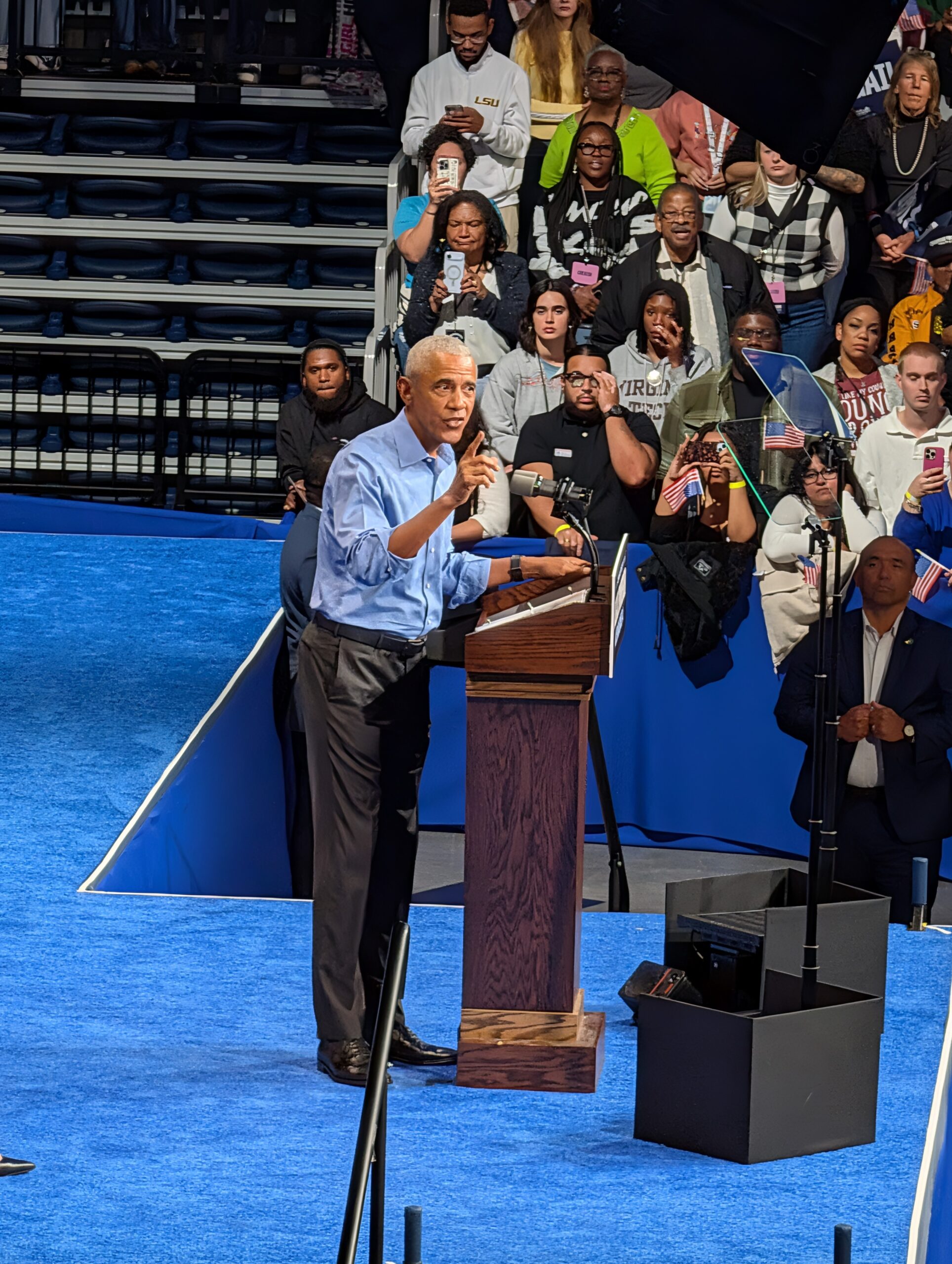 I just Norfolk deltar vi i kampanjsäsongens mest välbesökta evenemang. Före detta president Barack Obama agerar dragplåster – och hans karismatiska tal fokuserar utöver Trumps galenskaper på plånboksfrågorna. Hela delstaten lider av att de uteblivna löne- och bidragsutbetalningarna. Vanligtvis brukar konsumtionen under Halloween driva på den ekonomiska motorn, och mellan tullhot, höga räntor och uteblivna löner mår Virginias ekonomi inte bra.
